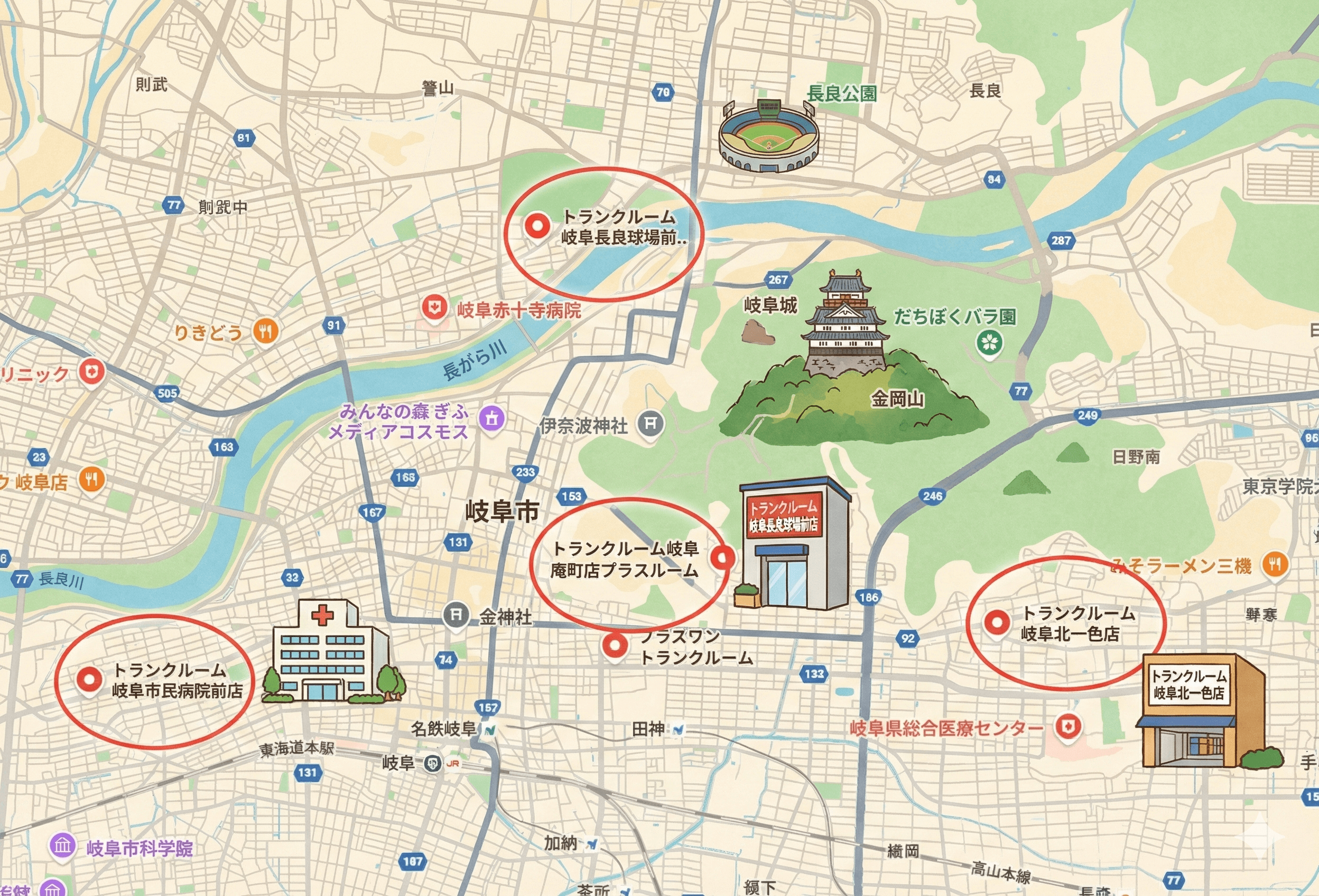 岐阜市のトランクルームは「自宅から一番近いトランクルーム」を目指し、岐阜市内に出店しております。きっとご自宅の近くにプラスルームのトランクルームはございます。下記店舗一覧にてお探しください。