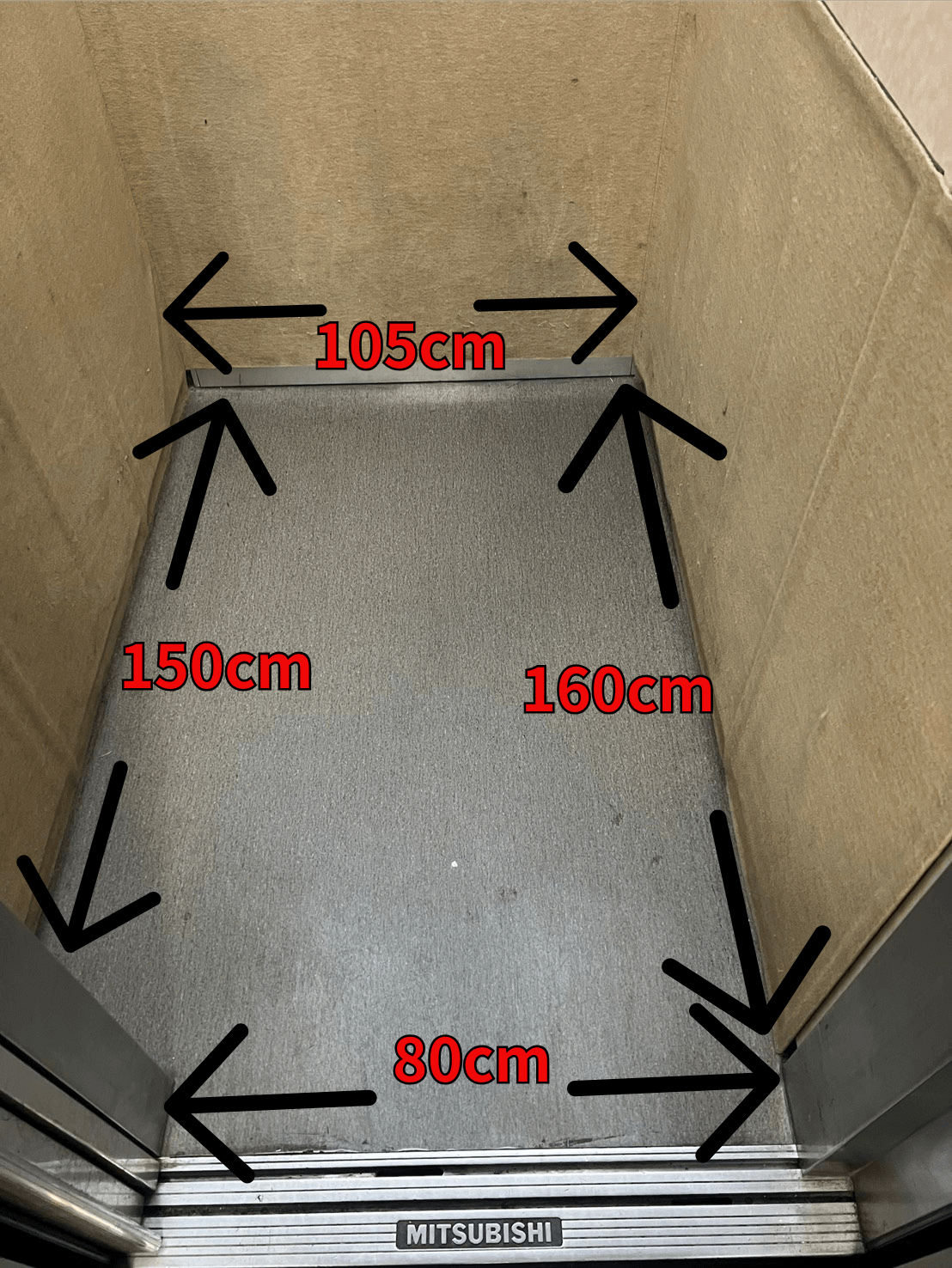 店舗は2階にございますが、エレベーターを利用出来ますので、重い荷物もラクラク搬入!エレベーター内の寸法は下記の通りです。