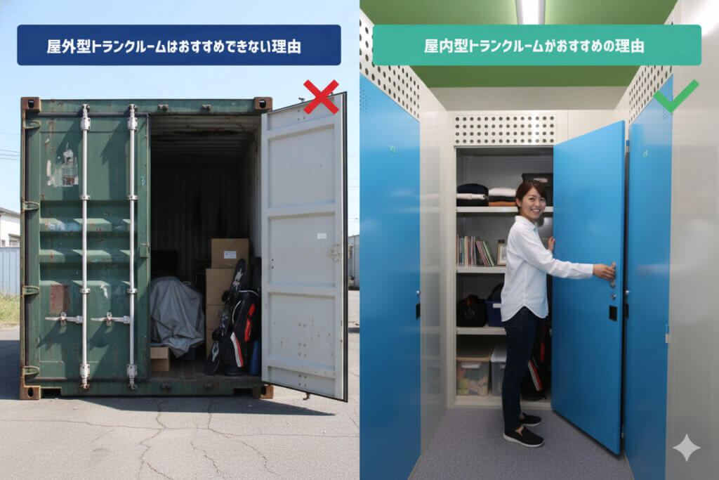 「トランクルームなら、安い屋外のコンテナでもいいのでは?」 そう思われるかもしれません。しかし、大切な家財を預け、自宅のクローゼットの延長として使うならば、絶対に「屋内型」をおすすめします。