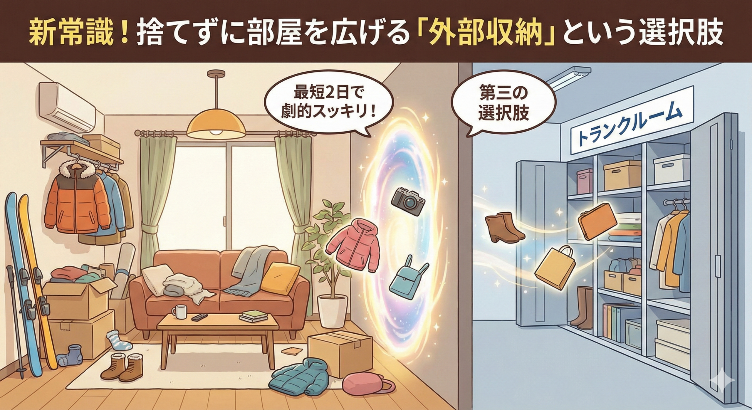 ここで提案したいのが、「捨てる」でも「詰め込む」でもない、第三の選択肢。それが**「トランクルーム(外部収納)」の活用**です。特にこれまで利用したことがない方にとっては、「荷物を預けるなんて大げさな…」と思われるかもしれません。しかし、実はこれこそが、最短2日で部屋を劇的に変える「切り札」なのです。